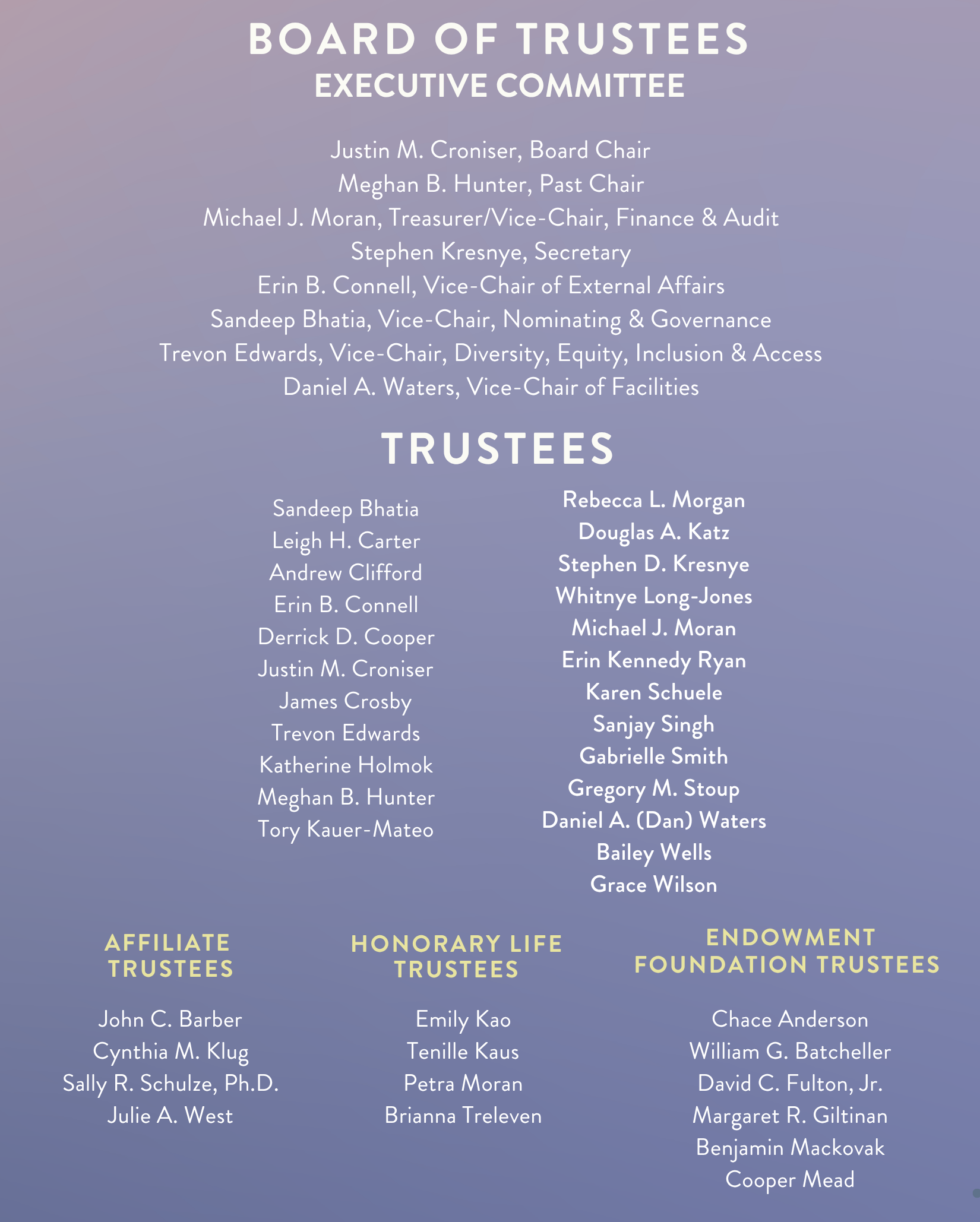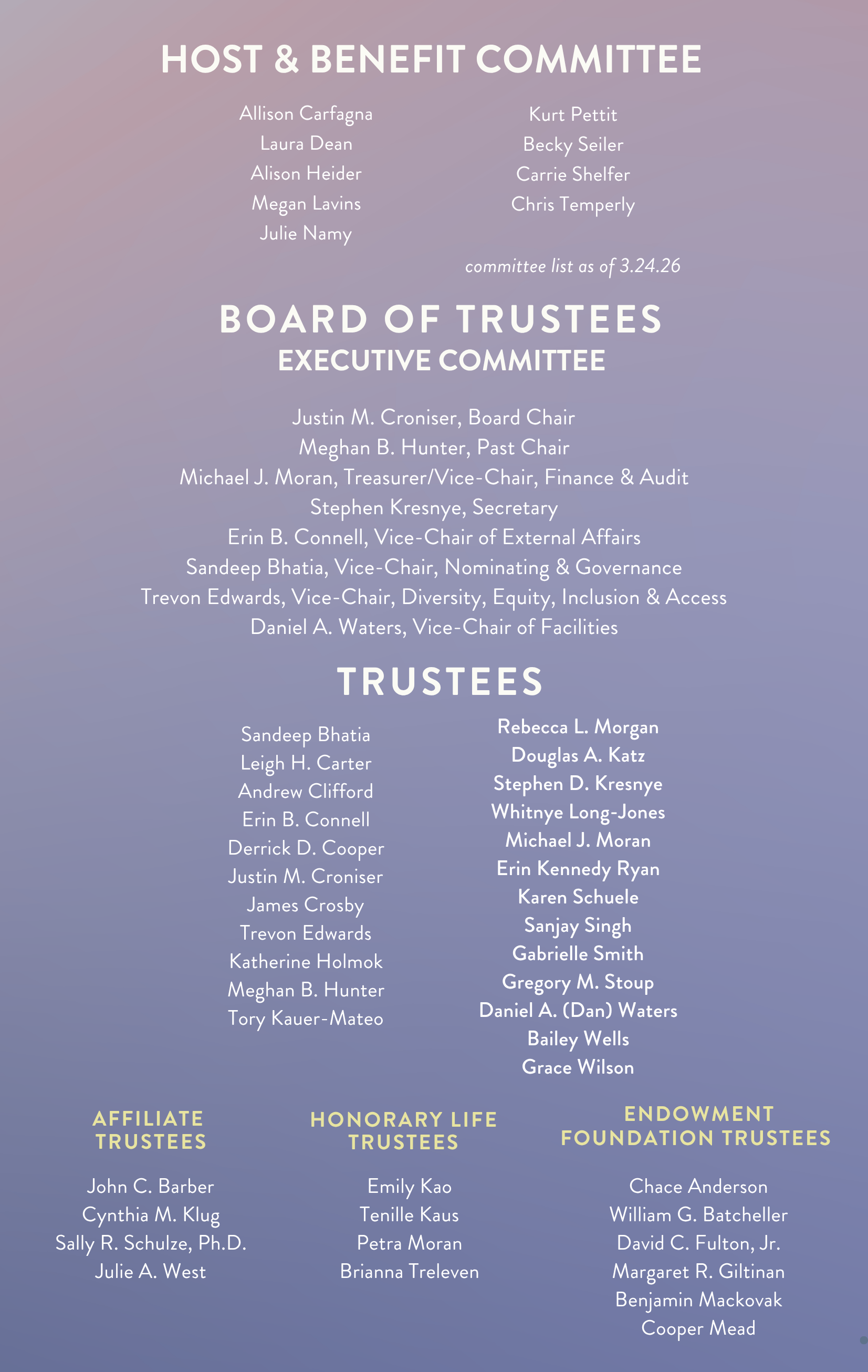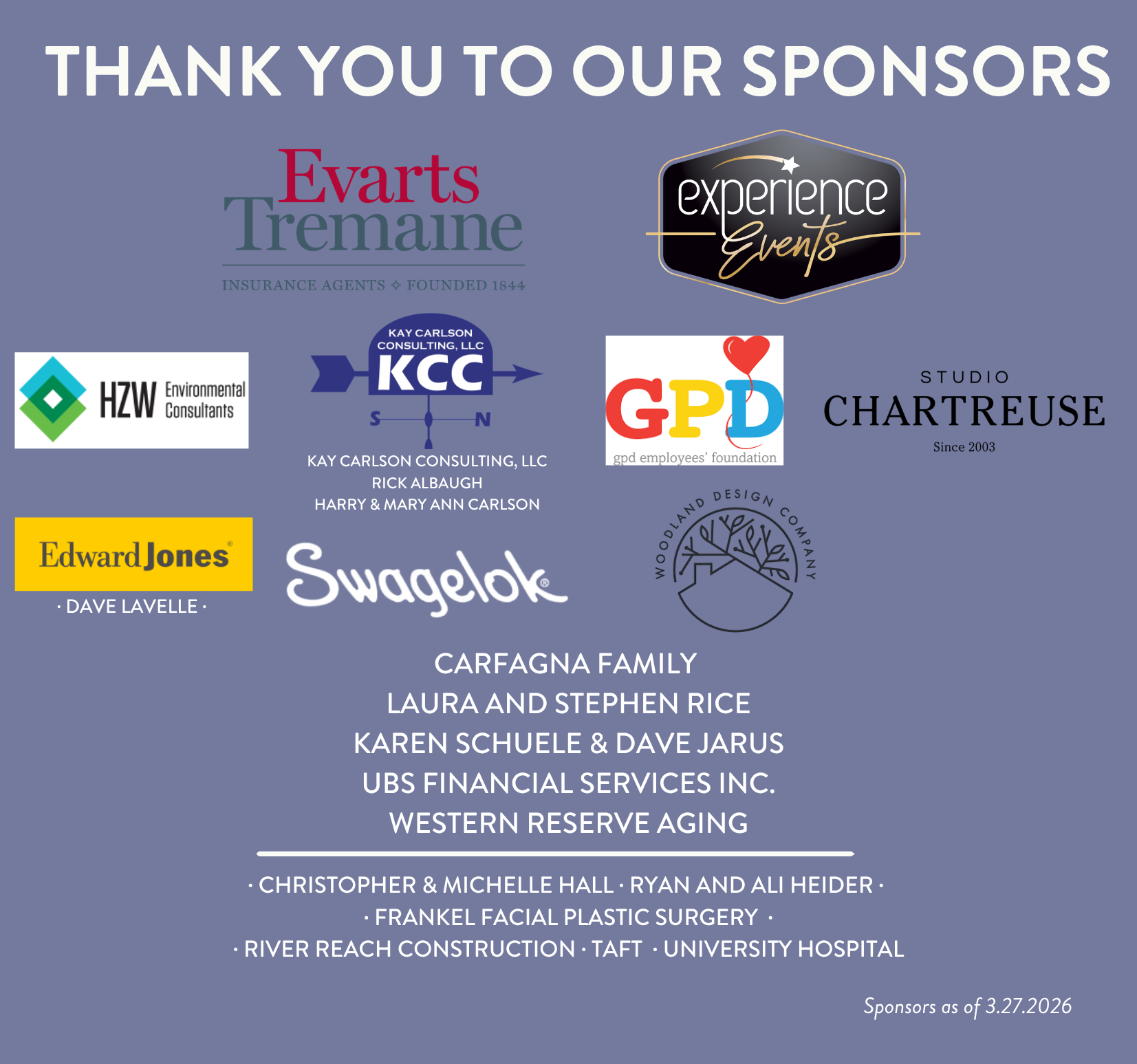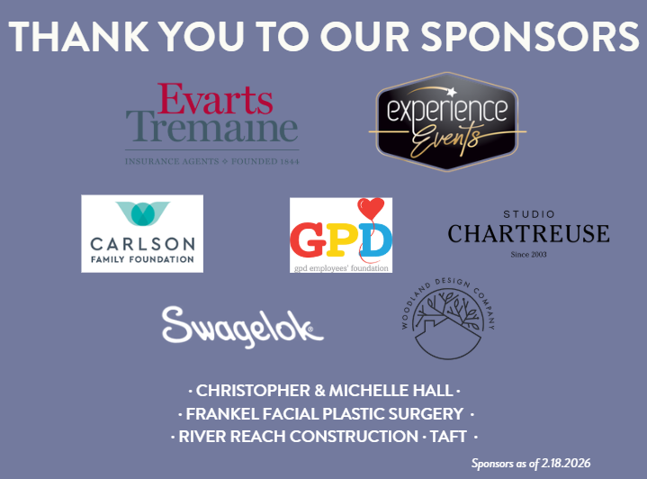 BNY Mellon Wealth Management ∙ Cirrus Wealth Management ∙ Deloitte ∙ Edward Jones Investments ∙ Woodland Design ∙ UBS Financial Services Inc. - Cynthia Bassett & John Egan ∙ Gail & Jim Arnold ∙ Peter & Rita Carfagna ∙ Harry & Mary Ann Carlson ∙ Clearstead ∙ Graham & Kerianne Hearns ∙ Jackson Lewis PC ∙ Meredith Camp Events LLC ∙ Marge & Dan Moore ∙ Nordson ∙ studio Chartreuse ∙
