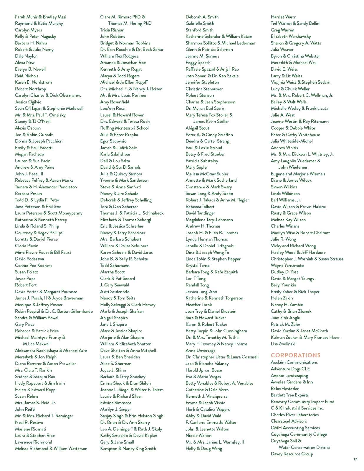 If you would like to change the way your name is listed in future publications or have other corrections, please contact Cara Anderson at 216.321.5935 ext. 232 or cara@shakerlakes.org.